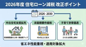 速報!! 2025年12月19日に発表された「2026年度(令和8年度)税制改正大綱」により、住宅ローン減税の仕組みが大きく変わることになりました。 今回の改正は、単なる期間の延長だけでなく、「中古住宅(既存住宅)への支 […]